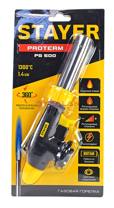 STAYER ProTerm PG 500, 1300°C, увеличенный выход пламени, газовая горелка с пьезоподжигом на баллон с цанговым соединением