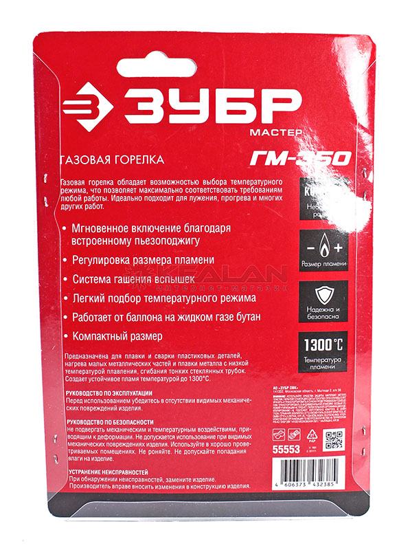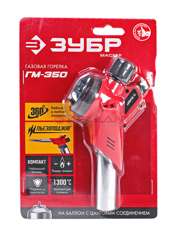 ЗУБР ГМ-350, 1300°C, газовая горелка с пьезоподжигом на баллон с цанговым соединением
