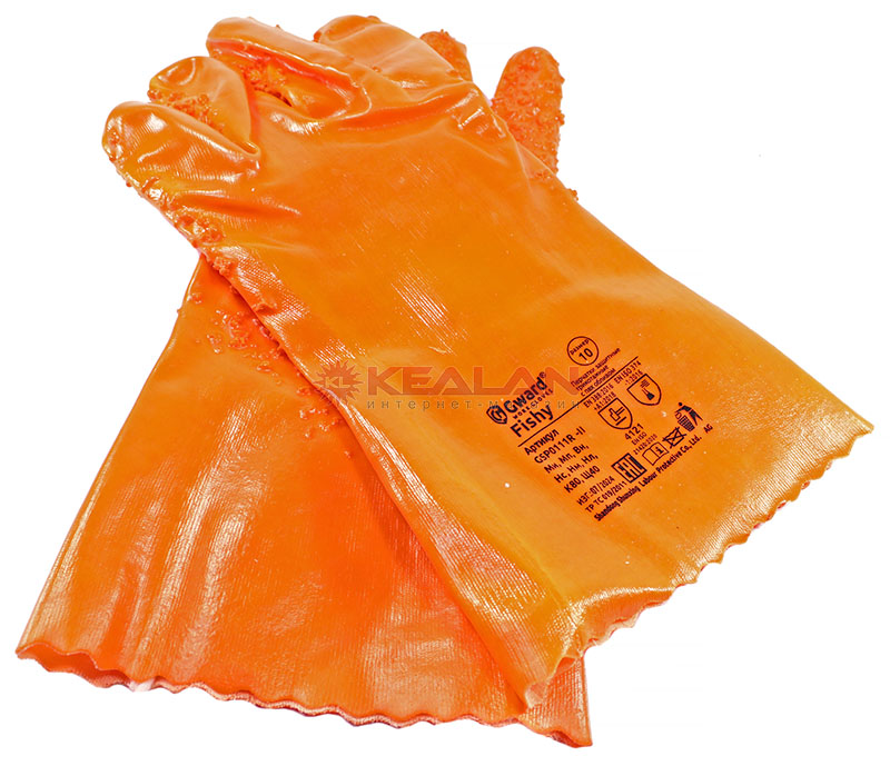 Gward Fishy также известные как "Перчатки рыбообработчика". Полностью покрытые ПВХ удлинённые МБС КЩС перчатки с ПВХ крошкой на ладони и пальцах. Конструкция: Перчатки из вязаной хлопчатобумажной основы с антибактериальной пропиткой. Покрытие стойким к пониженным температурам поливинилхлоридом оранжевого цвета. Манжета "ZIG-Zag". Покрытие герметично. Анатомическая конструкция перчаток снижает нагрузку на руки и способствует снижению их преждевременной утомляемости. Длительный срок службы и отличные эксплуатационные характеристики.