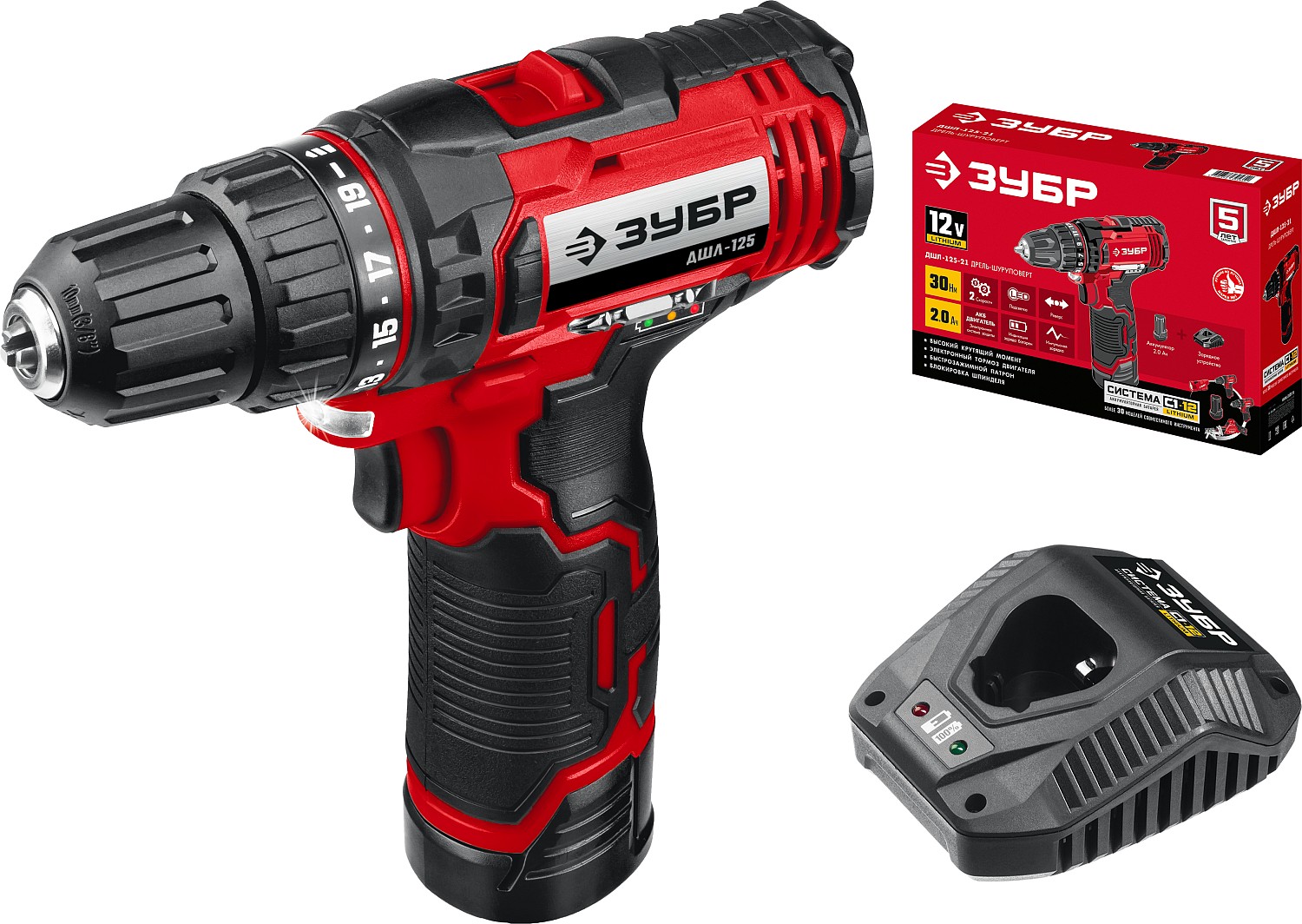 ЗУБР ДШЛ-125-21 С1-12, 12 В, 30 Нм, 1 АКБ, дрель-шуруповерт