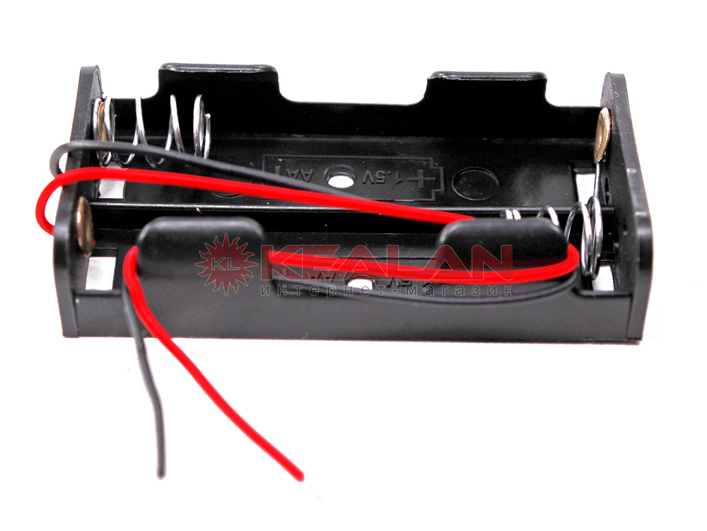 Батарейный отсек (держатель батареек) для двух батарей типоразмера АА с контактными проводами предназначен для подключения питания в различном оборудовании (в том числе в бытовых устройствах, игрушках и радиоуправляемых моделях). В целях ускорения и удобства монтажа держатель выполнен с двумя проводами (красного и черного цвета) длиной по 13 см, т.е. не требует пайки контактов. Окончания проводов подготовлены для дальнейшего монтажа: зачищены и обложены оловом. Суммарное напряжение при использовании 2-х батареек на 1.5 В - составит 3 В.