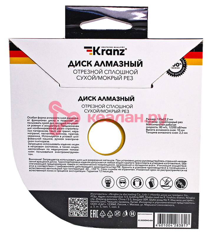 Диск алмазный отрезной сплошной KRANZ предназначен для сухой и мокрой резки строительных материалов, таких как гранит, керамогранит, песчаник, клинкер, мрамор, керамика. Используется в угловой шлифовальной машине, ручном электрическом плиткорезе. Инструмент выполнен из инструментальной стали и синтетического алмаза. Изготовлен методом горячего прессования, что значительно улучшает качество металлической связки и обеспечивает высокую концентрацию алмазов. Процесс резки сопровождается воздушным охлаждением за счет особой формы алмазного слоя, который расширяет функционал диска и позволяет использовать сухой рез, который получается ровным и аккуратным. Срок годности не ограничен. Хранить в сухом прохладном месте. Использовать строго по назначению. Внимание! Запрещается использовать диск для разрезания металлов. При установке диска руководствуйтесь стрелкой направления вращения диска. Используйте средства индивидуальной защиты. Не утилизировать с бытовыми отходами. -