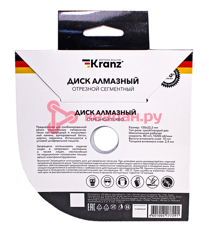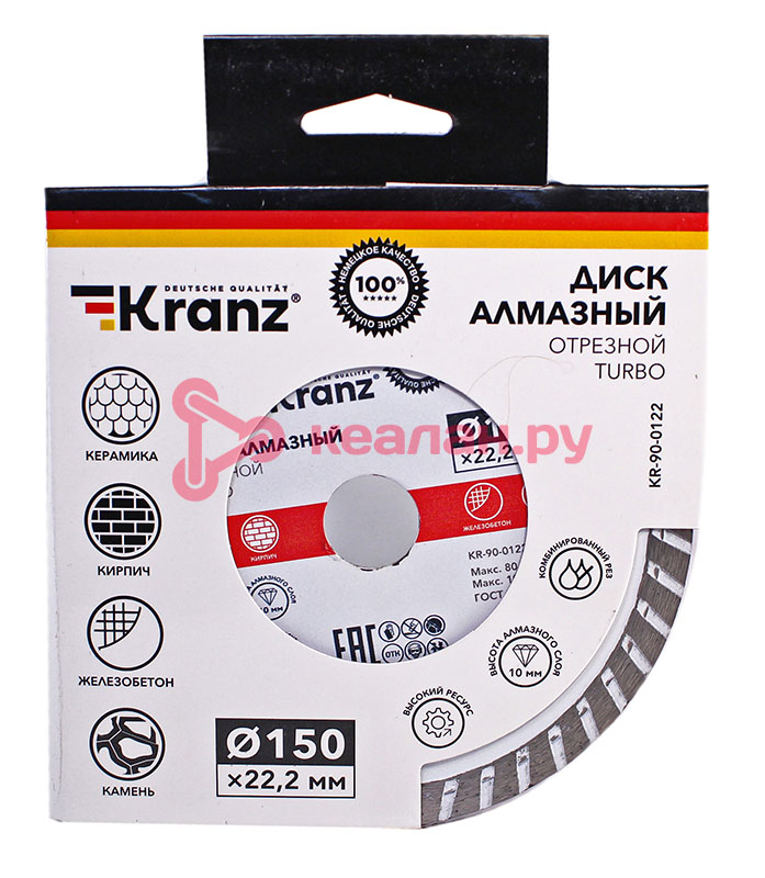 Отрезной алмазный диск Turbo используется для сухой и влажной резки строительных материалов, таких как кирпич, керамика, керамогранит, природный и искусственный камень, армированный и неармированный бетон. Применяется совместно с угловыми шлифовальными машинами, ручными электрическими плиткорезами, штроборезами. Диск состоит из стального корпуса и алмазного рабочего слоя, с высотой кромки 10 мм, что обеспечивает эффективную резку материала и долгий срок службы самого диска. Наличие специальных прорезей на ободе увеличивает скорость резки, повышает воздушное охлаждение, способствует отводу пыли, а также позволяет работать с диском без водяного охлаждения. Срок годности не ограничен. Хранить в сухом прохладном месте. Использовать строго по назначению. Внимание! Запрещается использовать диск для разрезания металлов. При установке диска руководствуйтесь стрелкой направления вращения диска. Используйте средства индивидуальной защиты. Не утилизируйте с бытовыми отходами. -