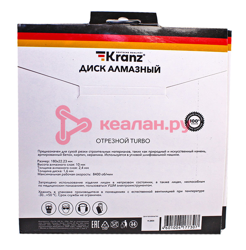 Отрезной алмазный диск Turbo используется для сухой и влажной резки строительных материалов, таких как кирпич, керамика, керамогранит, природный и искусственный камень, армированный и неармированный бетон. Применяется совместно с угловыми шлифовальными машинами, ручными электрическими плиткорезами, штроборезами. Диск состоит из стального корпуса и алмазного рабочего слоя, с высотой кромки 10 мм, что обеспечивает эффективную резку материала и долгий срок службы самого диска. Наличие специальных прорезей на ободе увеличивает скорость резки, повышает воздушное охлаждение, способствует отводу пыли, а также позволяет работать с диском без водяного охлаждения. Срок годности не ограничен. Хранить в сухом прохладном месте. Использовать строго по назначению. Внимание! Запрещается использовать диск для разрезания металлов. При установке диска руководствуйтесь стрелкой направления вращения диска. Используйте средства индивидуальной защиты. Не утилизируйте с бытовыми отходами. -