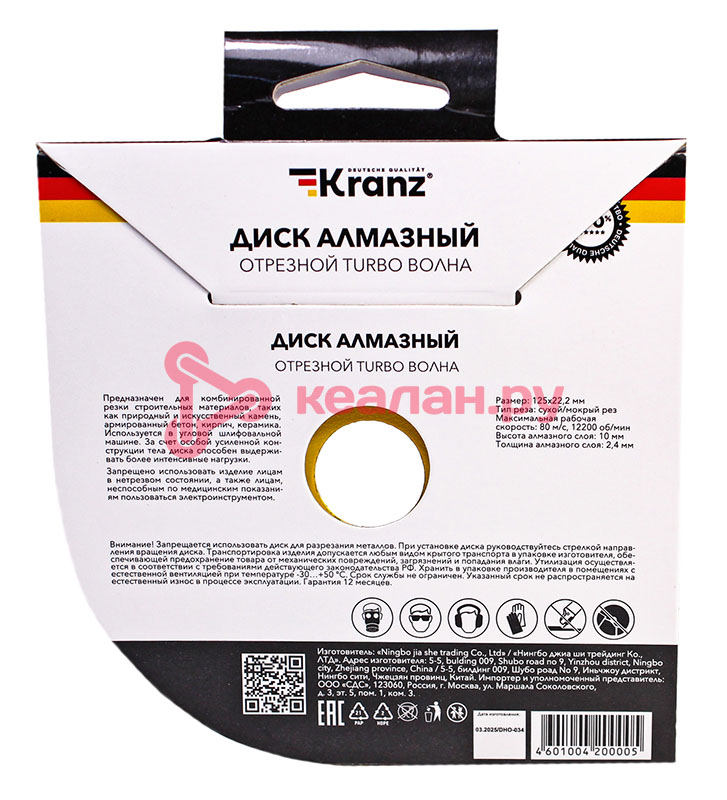 Диск алмазный отрезной Turbo волна применяется для сухой и влажной резки строительных материалов, таких как природный и искусственный камень, армированный и неармированный бетон, кирпич, керамика и керамогранит. Применяется совместно с в угловыми шлифовальными машинами, ручными электрическими плиткорезами, штроборезами. Благодаря специальной конструкции Turbo волны, диск обладает более высокой скоростью резки и улучшенным охлаждением. За счет особой усиленной конструкции тела диска способен выдерживать более интенсивные нагрузки. Диск состоит из стального корпуса и алмазного рабочего слоя с высотой кромки 10 мм, что обеспечивает эффективную резку материала и долгий срок службы самого диска. Процесс резки сопровождается воздушным охлаждением за счет турбированной формы алмазного слоя. Это позволяет пилить без водяного охлаждения. Срок годности не ограничен. Хранить в сухом прохладном месте. Использовать строго по назначению. Внимание! Запрещается использовать диск для разрезания металлов. При установке диска руководствуйтесь стрелкой направления вращения диска. Используйте средства индивидуальной защиты. Не утилизируйте с бытовыми отходами. -