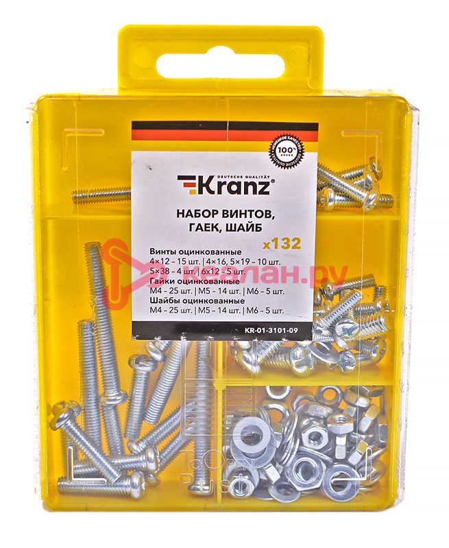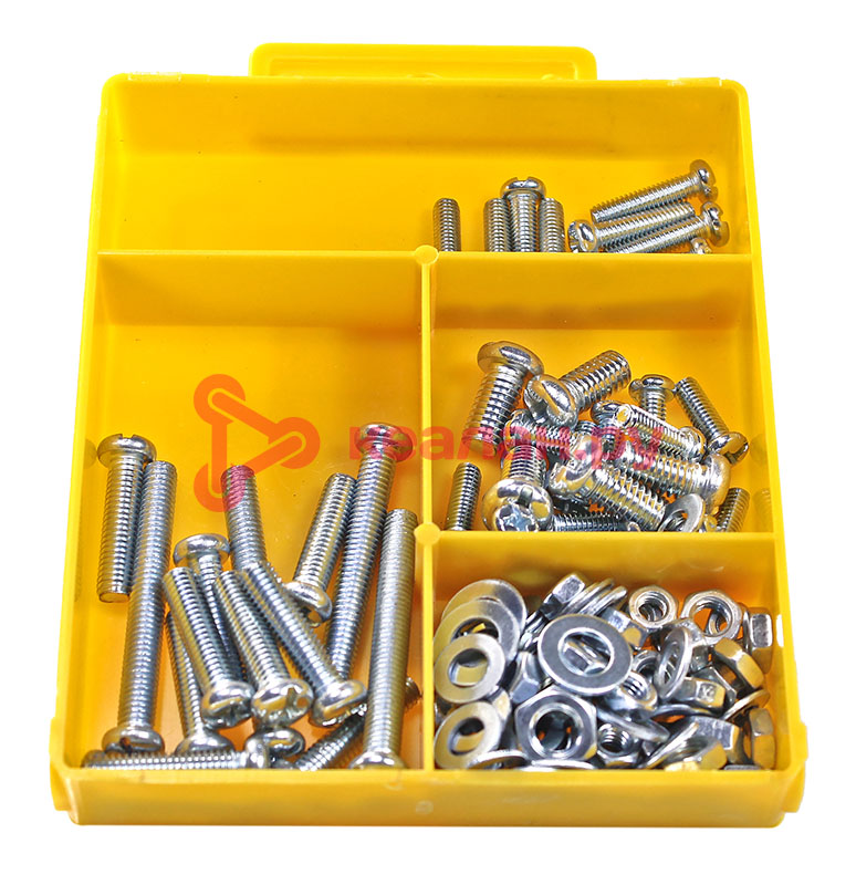 Набор винтов, гаек и шайб предназначен для соединения деталей при сборке мебели, монтаже и установке бытовой техники, закреплении различных строительных конструкций. Готовый набор сэкономит время, которое могло бы уйти на подбор элементов крепежа подходящего размера. Крепежные изделия изготовлены из высококачественного материала, который обеспечивает высокую прочность и долговечность. Набор состоит из 132 крепежных элементов, которых хватит на выполнение большого количества задач. Поставляется в пластиковом органайзере, который помогает не только удобно хранить изделия, но и быстро находить крепеж нужного размера. Органайзер может в дальнейшем использоваться для хранения других крепежных элементов. Состав набора: – винт оцинкованный 4×12 (15 шт.); 4×16 (10 шт.); 5×19 (10 шт.); 5×38 (4 шт.); 6x12 (5 шт.); – гайка оцинкованная M4 (25 шт.); M5 (14 шт.); M6 (5 шт.); – шайба оцинкованная M4 (25 шт.); M5 (14 шт.); M6 (5 шт.). -