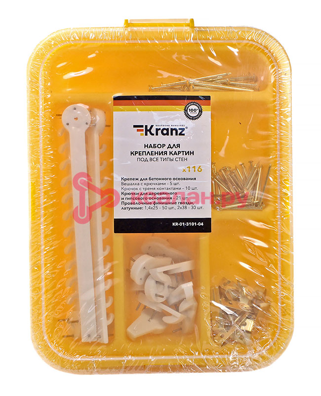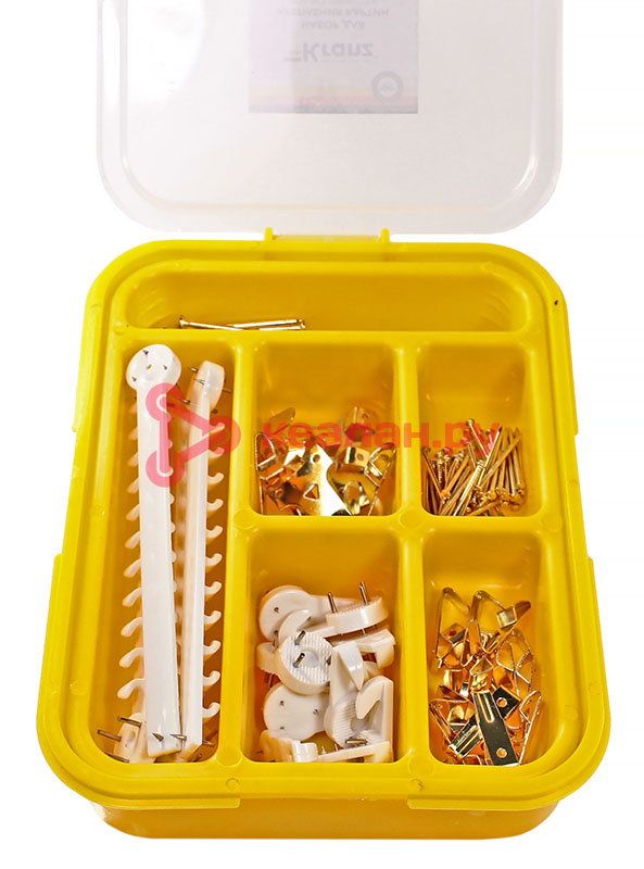 Набор картинного крепежа предназначен для крепления картин. Включает в себя несколько видов крепежных элементов, таких как крючки и гвозди, которые подойдут под разные типы стен, а также под полотна разного веса и размера. Набор изготовлен из высококачественных материалов, которые гарантируют долгий срок службы элементам крепежа, а также надежную фиксацию и сохранность картин. Набор состоит из 116 крепежных элементов, которых хватит для крепления сразу нескольких картин. Поставляется в пластиковом органайзере, который помогает не только удобно хранить изделия, но и быстро находить крепеж нужного размера. Органайзер может в дальнейшем использоваться для хранения других крепежных изделий. Состав набора: – крепеж для бетонного основания: вешалка настенная с крючками (5 шт.); крючок настенный с тремя контактами (10 шт.); – крепеж для деревянного и гипсового основания: крючки (6 шт.); крючки двойные (15 шт.); – проволочные финишные гвозди, латунные: 1,4х25 (50 шт.); 2,0х38 (30 шт.). -