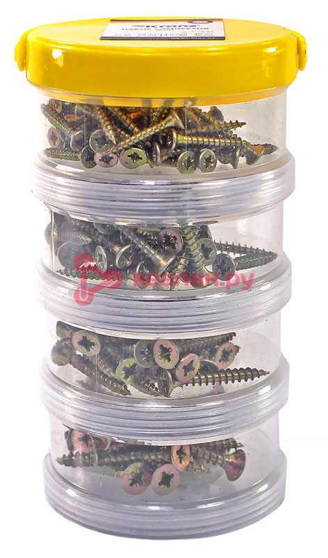 Набор саморезов используется для крепления тонколистового металла, древесно-стружечных и гипсокартонных плит, брусьев, досок, полимерных ламелей к деревянным основаниям без предварительного сверления. В комплексе с пластиковым дюбелем универсальные саморезы (PZ) DIN 7962 могут использоваться для крепления к бетону, кирпичу, шлакоблоку. Саморезы изготовлены из стали, покрытой желтым цинком, что обеспечивает изделиям высокую прочность и долговечность. Набор состоит из 140 саморезов для ДСП, которых хватит для выполнения множества задач. Поставляется в практичном сборном пластиковом органайзере. Органайзер состоит из отдельных контейнеров, соединенных между собой с помощью винтовой резьбы, что упрощает хранение и организацию крепежа. Такой дизайн позволяет легко находить и использовать нужные саморезы и поддерживает порядок в крепеже. Органайзер может в дальнейшем использоваться для хранения других крепежных элементов. Набор состоит из саморезов 3,0×19 (60 шт.); 3,5×25 (40 шт.); 4,0×30 (25 шт.); 4,5×40 (15 шт.). -