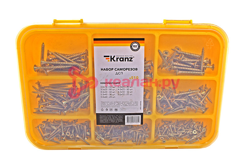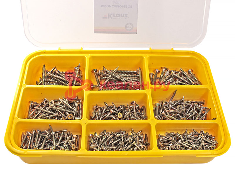 Набор саморезов используется для крепления тонколистового металла, древесно-стружечных и гипсокартонных плит, брусьев, досок, полимерных ламелей к деревянным основаниям без предварительного сверления. В комплексе с пластиковым дюбелем универсальные саморезы DIN 7962 могут использоваться для крепления к бетону, кирпичу, шлакоблоку. Саморезы изготовлены из стали, покрытой желтым цинком, что обеспечивает изделиям высокую прочность и долговечность. Большой набор состоит из 510 саморезов для ДСП и подойдет для объемных и длительных проектов. Поставляется в пластиковом органайзере, который помогает не только удобно хранить изделия, но и быстро находить крепеж нужного размера. Органайзер может в дальнейшем использоваться для хранения других крепежных элементов. Набор состоит из саморезов 3,0x16 (120 шт.); 3,5x20 (80 шт.); 3,5x25 (60 шт.); 4,0x25 (60 шт.); 4,0x30 (60 шт.); 4,0x40 (50 шт.); 5,0x40 (30 шт.); 5,0x50 (25 шт.); 5,0x60 (25 шт.). -