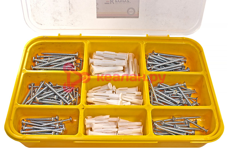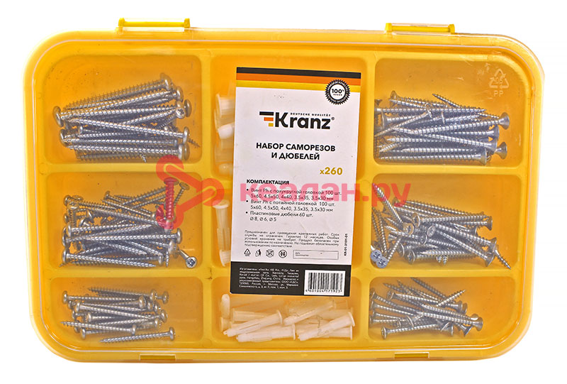 Набор саморезов и дюбелей предназначен для выполнения крепежных работ: фиксации различных предметов и деталей к основаниям из дерева, бетона, кирпича. Саморезы изготовлены из стали, покрытой цинком, что обеспечивает изделиям высокую прочность и долговечность. В наборе два вида саморезов: с полукруглой головкой для надежного крепления тонколистовых материалов и с потайной головкой – используются там, где крепеж не должен выступать над поверхностью материала. Специальные зубцы и блокировочные язычки дюбелей обеспечивают максимальную силу трения в основании, препятствуя проворачиванию и вырыванию крепежа. Набор состоит из 260 крепежных элементов, которых хватит для выполнения множества задач, поставляется в пластиковом органайзере, который помогает не только удобно хранить изделия, но и быстро находить крепеж нужного размера. Органайзер может в дальнейшем использоваться для хранения других крепежных элементов. Состав набора: – саморезы с полукруглой головкой, PH 5,0х60 мм (20 шт.); 4,5х50 мм (20 шт.); 4,0х40 мм (20 шт.); 3,5х35 мм (20 шт.); 3,5х30 мм (20 шт.); – саморезы с потайной головкой, PH 5,0х60 мм (20 шт.); 4,5х50 мм (20 шт.); 4,0х40 мм (20 шт.); 3,5х35 мм (20 шт.); 3,5х30 мм (20 шт.); – пластиковые дюбели ⌀8 (20 шт.); ⌀6 (20 шт.); ⌀5 (20 шт.). -