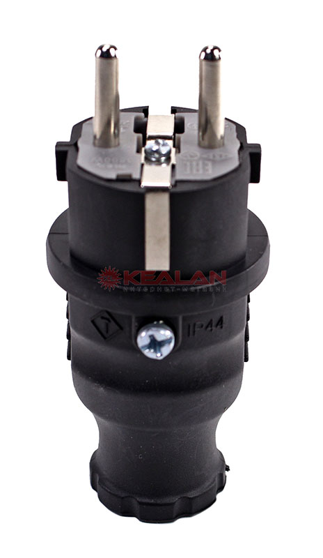 Влагозащищенная вилка предназначена для подключения бытовых и профессиональных приборов к электросети. Вилка разработана для использования в сложных эксплуатационных условиях с высокой влажностью. Широко применяется в быту, на производстве и в строительстве. Степень защиты IP44 позволяет использовать вилку для организации электропитания под открытым небом, а в дождь – под навесом. Не допускается погружение в воду. Для обеспечения безопасности детали, соприкасающиеся с токоведущими частями выполнены из огнеупорного материала, устойчивого к температуре до +850 ⁰С. Ударопрочный разборный корпус выполнен из каучука: устойчив к ударам, вибрациям и другим механическим воздействиям. Заземление: есть. Сечение проводников: 0,75-2,5 мм². Контактная группа: MS-58 (латунь). Тип полюсов: 2Р+РЕ. -