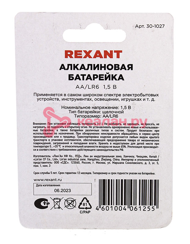 Алкалиновые батарейки AA/LR6 REXANT 4 шт. в блистерной упаковке. Характеристики: Номинальное напряжение: 1,5 В Тип батарейки: Щелочной Типоразмер: AA/LR6 Алкалиновые (щелочные) батарейки, наиболее распространенный тип батареек. Для выработки электричества в них используется щелочной электролит. Данный тип батареек работает в несколько раз дольше обычных солевых, не протекает, лучше переносит низкие температуры и имеет более высокий срок хранения. Применяются в самом широком спектре электробытовых устройств, инструментах, освещении, игрушках и т. д. -