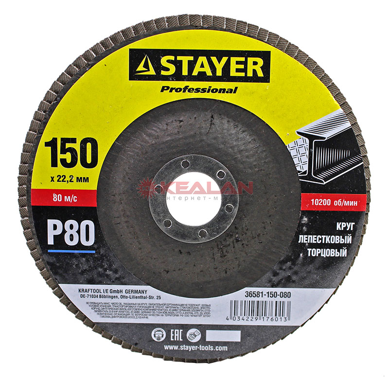 STAYER "PROFI" круг шлифовальный лепестковый торцевой, зерно-электрокорунд нормальный, тип КЛТ 1, P80, 150х22,2мм