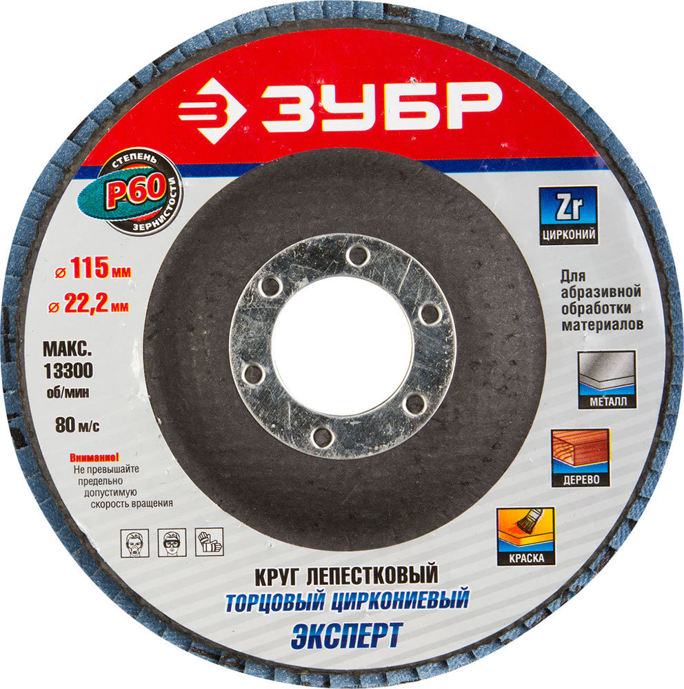 ЗУБР "ЭКСПЕРТ" круг шлифовальный лепестковый торцевой, тип КЛТ 1, зерно-электрокорунд циркониевый, P60, 115х22,2мм