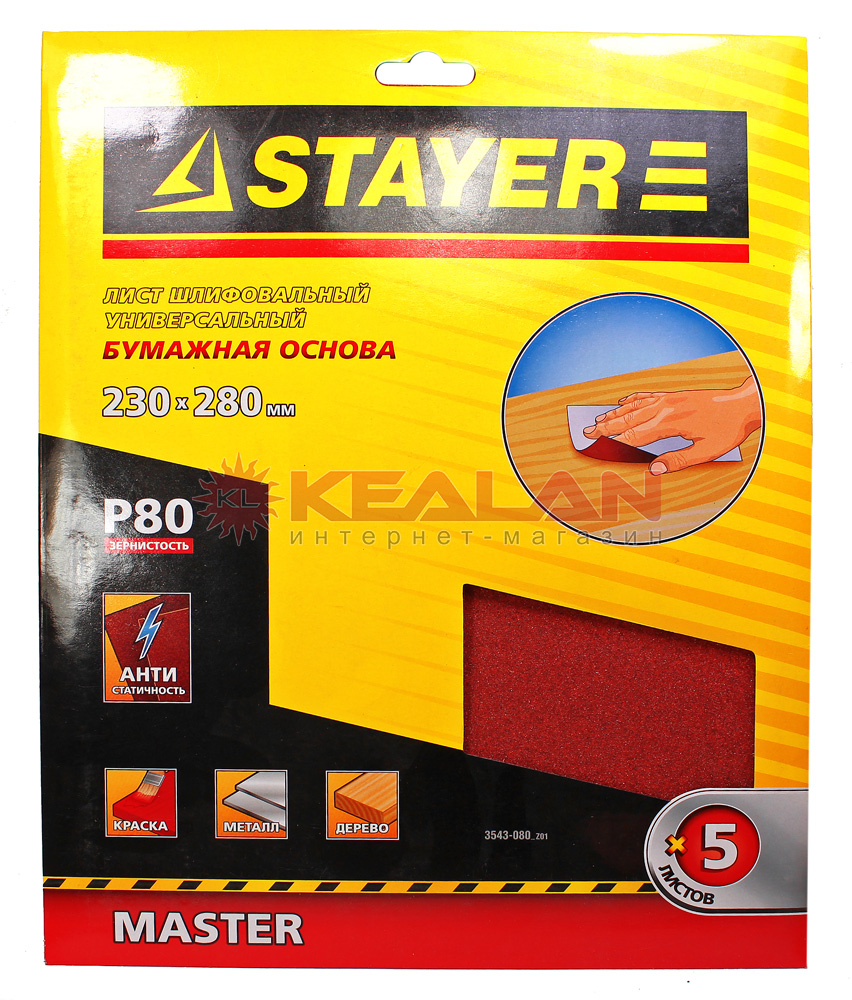 STAYER "MASTER" 3543-080_z01 лист шлифовальный универсальный на бумажной основе, 230х280 мм, Р80, в упаковке 5 шт.