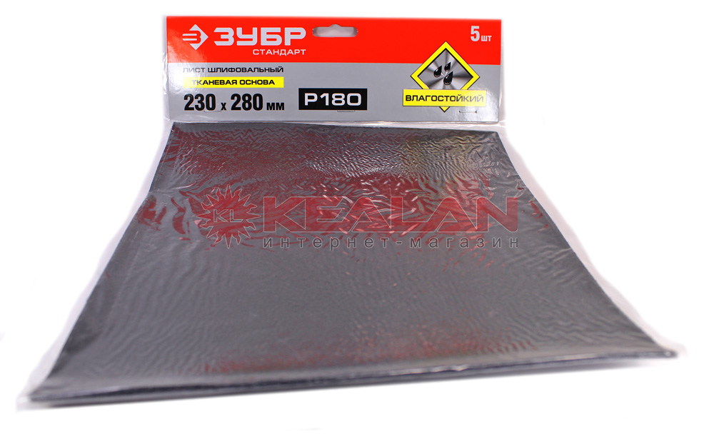ЗУБР "СТАНДАРТ" 35415-180 лист шлифовальный на тканевой основе, водостойкий, 230х280 мм, Р180, в упаковке 5 шт.