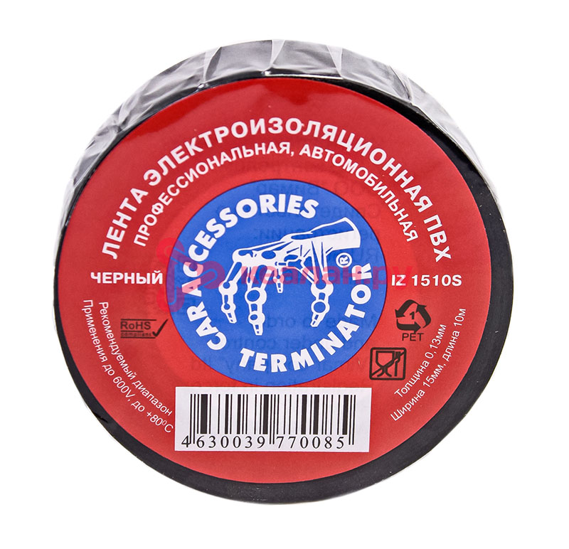 Terminator IZ 1510S изолента черная ПВХ, автомобильная, 0,13 мм, 15 мм, 10 м, в тубе 10 шт, в коробке 500 шт.