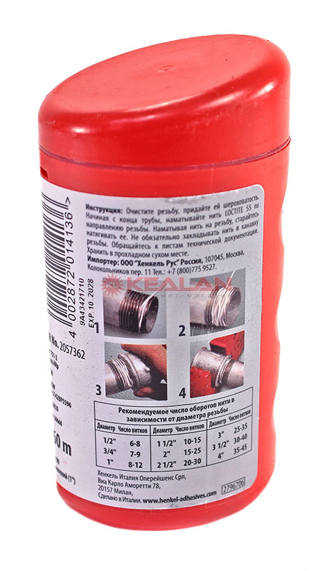Нить LOCTITE 55 мгновенно герметизирует резьбовое трубное соединение на максимальное давление. Не требуется полимеризация. Готовое к работе полимерное волокно в виде нити, наматывается на витки резьбы. Герметичность соединения достигается сразу же после монтажа. Является идеальным решением, когда требуется быстрая, легкая и надежная полимеризация. Поставляется в специальной упаковке, облегчающей использование нити и ее нанесение на витки резьбы. Допускается применение для уплотнение водопроводов с питьевой водой.